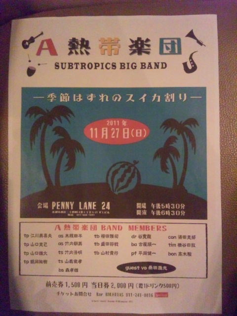 2(日) 清水紫(Sop)ライブ@スローハンド オペラアリアと日本の歌。 5(水) 世界のペット・ワン博@ファクトリーホール 高崎希美さん(Vn)とのデュオ 14(金) 入江バンド@三吉神社例大祭 エレキサウンドです。入場無料。 22(土) 高崎希美(Vn)ディナーコンサート@アートホテルズ1Fシンフォニー 典真さん(Sax)とのトリオです。 23(日) プレビューライブ@留萌ニューポート 28(金) 菩提樹月々ライブ 19:00開場、19:30開演 ゲストは境谷睦美さん(Vn) 30(日) 魔界組ライブ@メッセホール いろんなコピーをやります。 あとは、月~土いつもの店です!